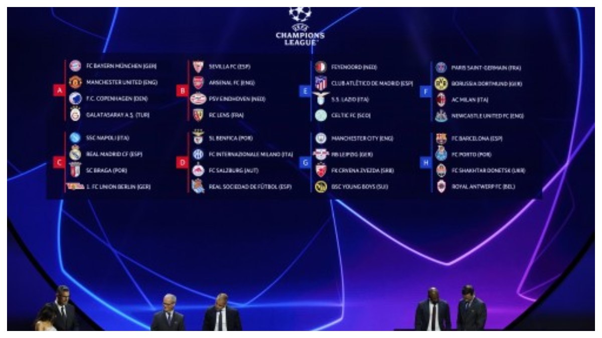'এফ' গ্রুপে প্যারিসের ক্লাব পিএসজির সঙ্গে আছে জার্মানির বরুসিয়া ডর্টমুন্ড, ইতালির এসি মিলান ও ইংল্যান্ডের নিউক্যাসল ইউনাইটেড। দুই স্প্যানিশ জায়ান্ট রিয়াল মাদ্রিদ, বার্সেলোনা অবশ্য তুলনামূলক সহজ গ্রুপে পড়েছে। রিয়ালের সঙ্গী নাপোলি, ব্রাগা ও ইউনিয়ন বার্লিন। বার্সার সঙ্গী পোর্তো, শাখতার ও অ্যান্টওয়ের্প।