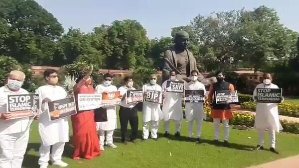 রাজ্যে আইনশৃঙ্খলার অবনতির অভিযোগ! সংসদের বাইরে প্রতিবাদ রাজ্যের বিজেপি সাংসদদের