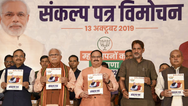 রবিবার বিজেপির ইস্তেহার প্রকাশের দু’দিন আগেই কংগ্রেসের পক্ষ থেকে নির্বাচনী ইস্তেহার প্রকাশ করা হয়। যেখানে কৃষকদের ঋণ মকুব, বেকারত্ব, প্রবীণ নাগরিকদের জন্য ৫,১০০ টাকা পেনশন, সরকারি চাকরিতে মহিলাদের জন্য ৩৩ শতাংশ সংরক্ষণ সহ বিভিন্ন প্রতিশ্রুতির কথা উল্লেখ রয়েছে। যেখানে বিজেপি বেকারত্ব ঘোচানোর জন্য কোনও পরিকল্পনার কথাই বলেনি। কংগ্রেসের এই ইস্তেহার নিয়ে হরিয়ানার মুখ্যমন্ত্রী মনোহর লাল খট্টর বলেন, 'কংগ্রেস ইস্তেহার অনুযায়ী দলের চাই ১.২৬ লক্ষ কোটি টাকা। যা পাঁচ বছরে জোগাড় করা কংগ্রেসের পক্ষে অসম্ভব। জনতা কংগ্রেসের মিথ্যা প্রতিশ্রুতি ধরে ফেলেছিল বলে লোকসভা নির্বাচনে তাদের জয়ী করেনি।’ রবিবার মুখ্যমন্ত্রীর উপস্থিতিতেই বিজেপির কার্যকরি সভাপতি জেপি নাড্ডা প্রকাশ করেন বিজেপির ইস্তেহার। সেটি হাতে নিয়ে খট্টর বলেছেন রাম রাজ্য তৈরির লক্ষ্যেই এই ইস্তেহার প্রকাশ করা হয়েছে।
