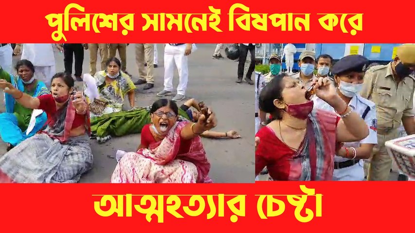 আর তা চলাকালীন শিক্ষিকারা পাল্টা স্লোগান দিতে থাকেন। আর তা দিতে দিয়ে আচমকাই ব্যাগ থেকে বিষ বার করে খেতে শুরু করে বলে দাবি পুলিশের। এই ঘটনা দেখেই কর্তব্যরত পুলিশ আধিকারিকরা সঙ্গে সঙে বিষের বোতল ছিনিয়ে নেওয়ার চেষ্টা করেন।