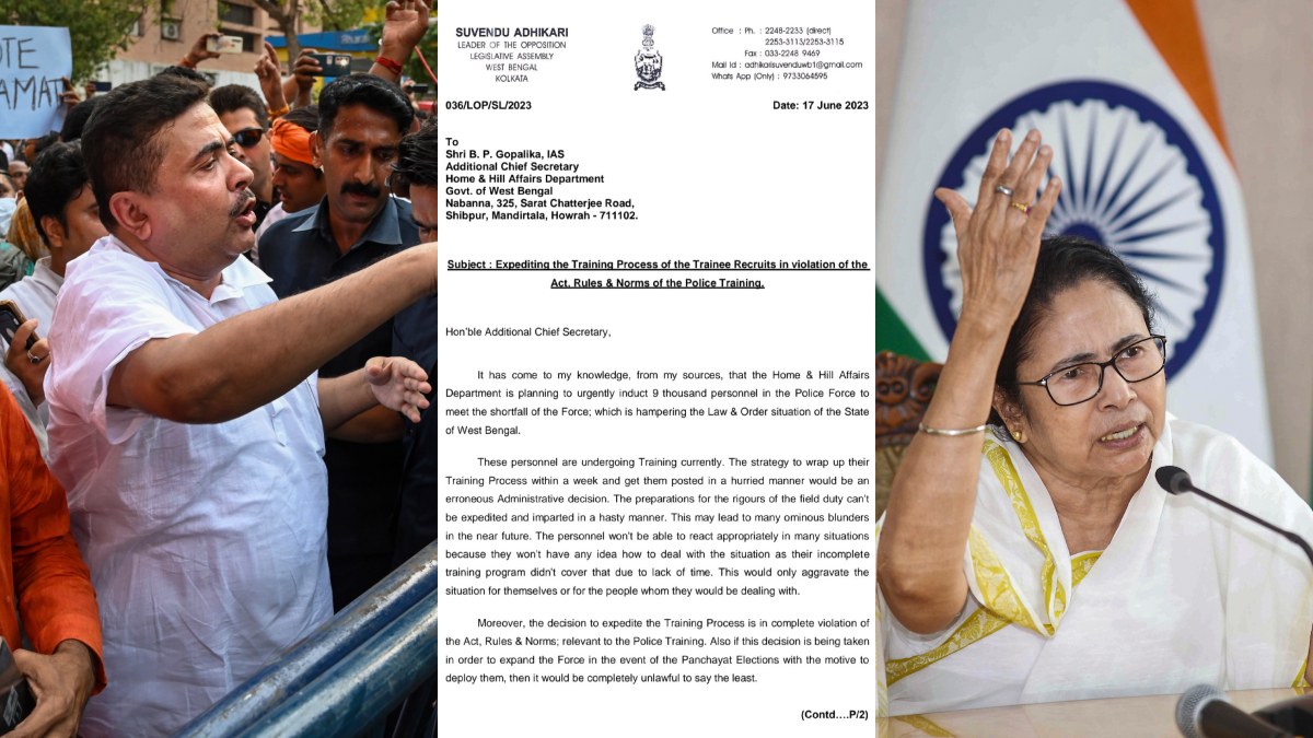 শুভেন্দুর দাবি, প্রশিক্ষণের বিষয়গুলিতে কাটছাঁট করে রাজ্য সরকার দ্রুত নিয়োগের পথে হাঁটছে এ কারণেই যাতে নির্বাচনের জন্য প্রয়োজনীয় পুলিশকর্মীর ঘাটতির পরিমাণ কম দেখায়। এতে পুলিশ প্রশিক্ষণের আইন, বিধি লঙ্ঘন করা হচ্ছে বলে বিপি গোপালিকাকে পাঠানো চিঠিতে উল্লেখ করেছেন বিরোধী দলনেতা।